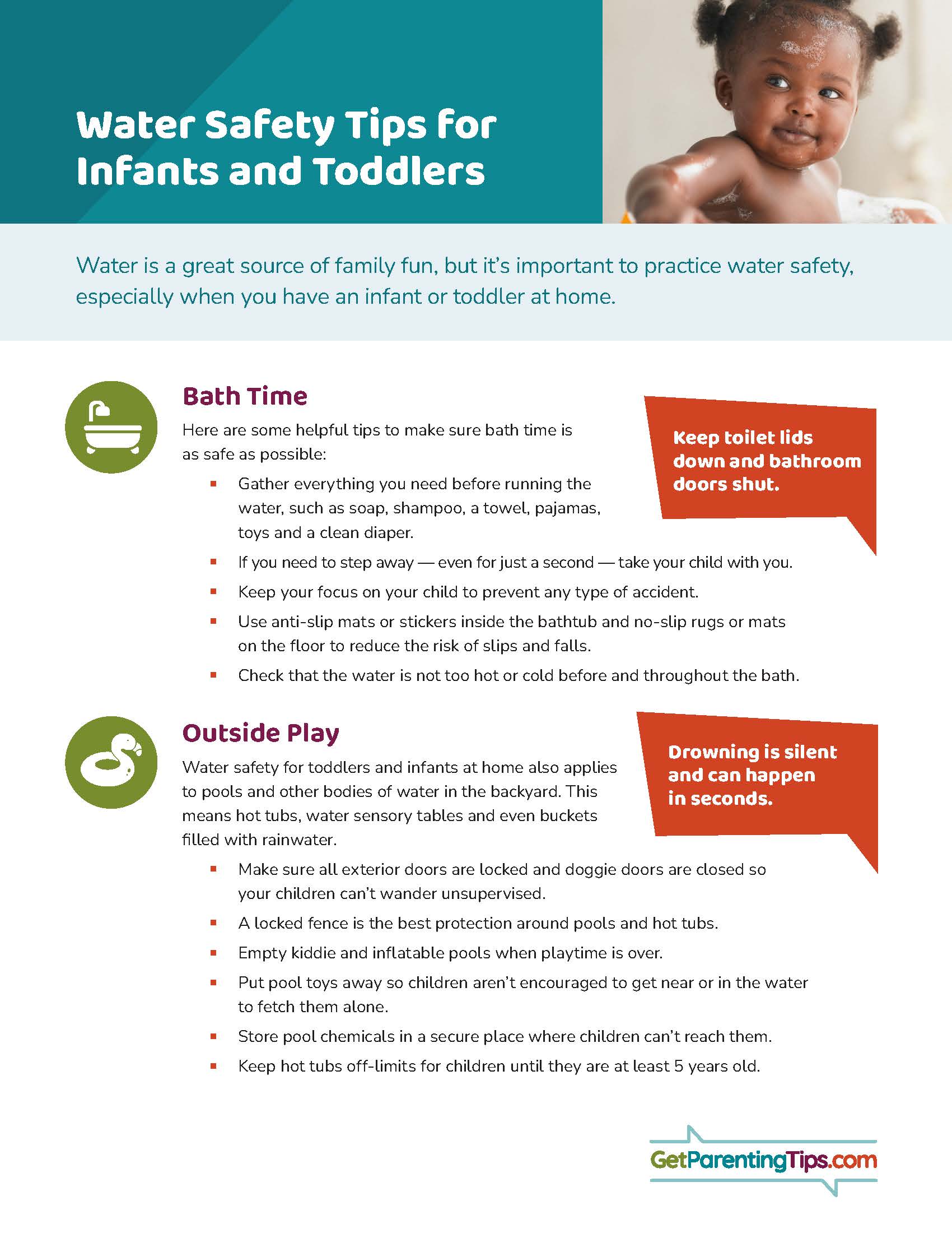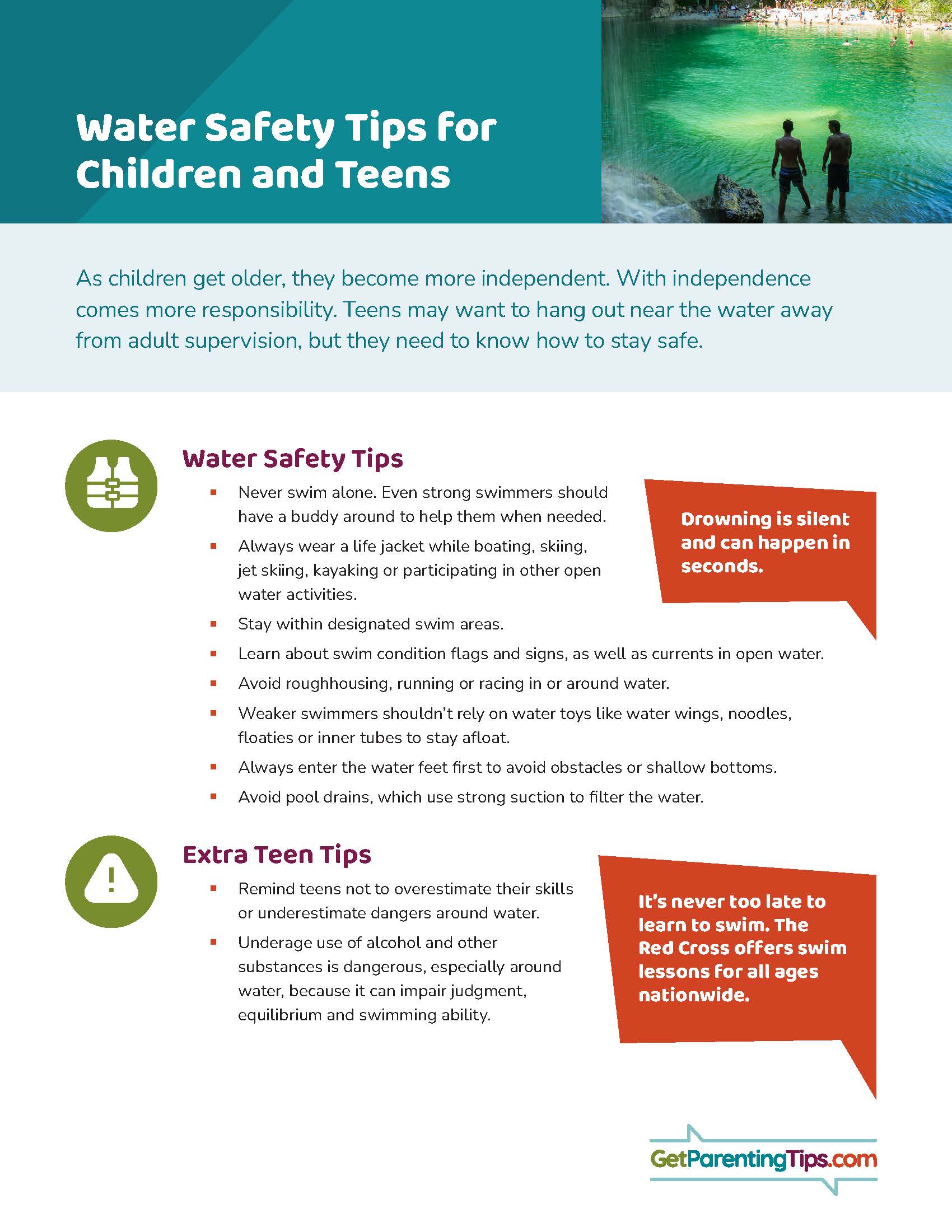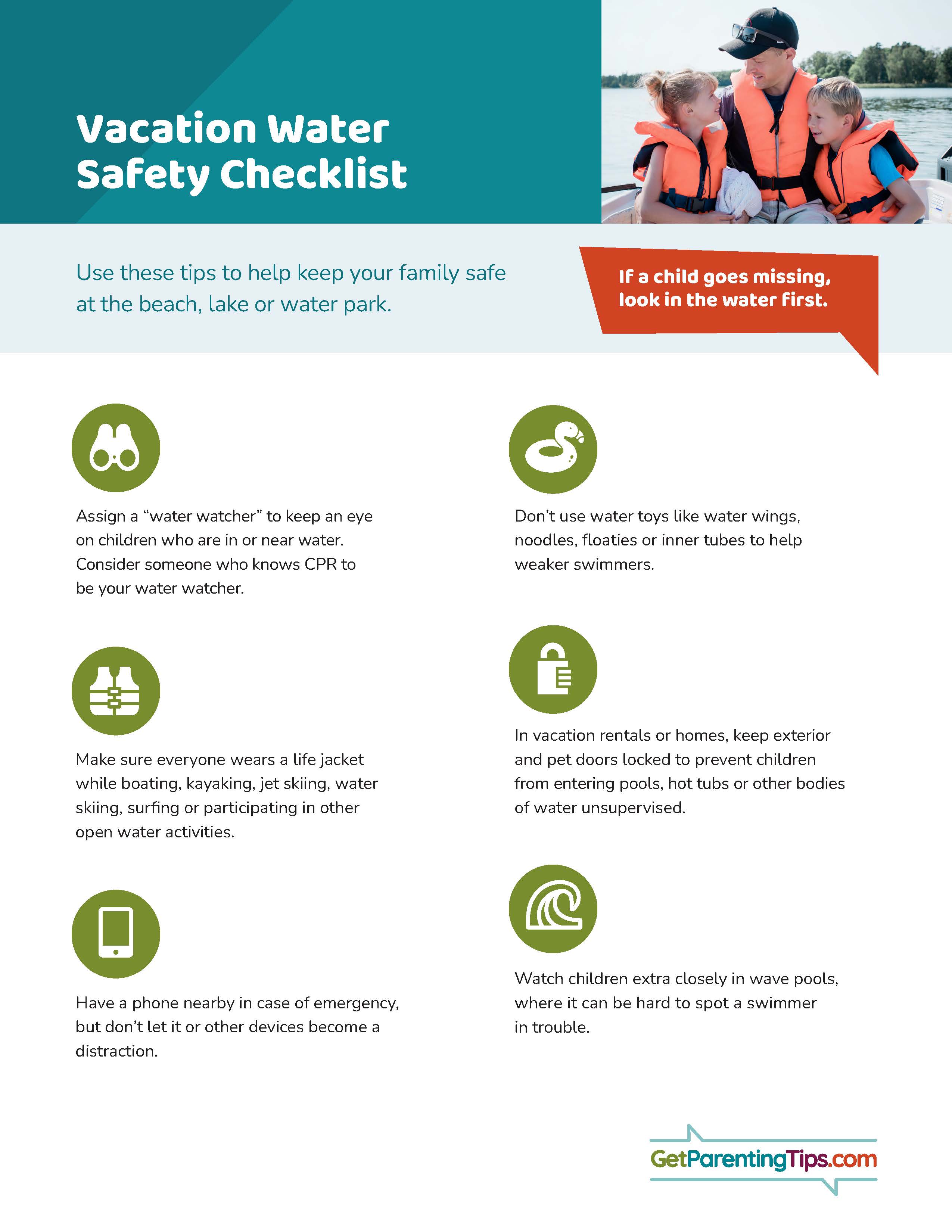 • Drowning can happen in seconds, so make sure your children always have an adult water watcher around. Check out GetParentingTips.com for more information about water safety.